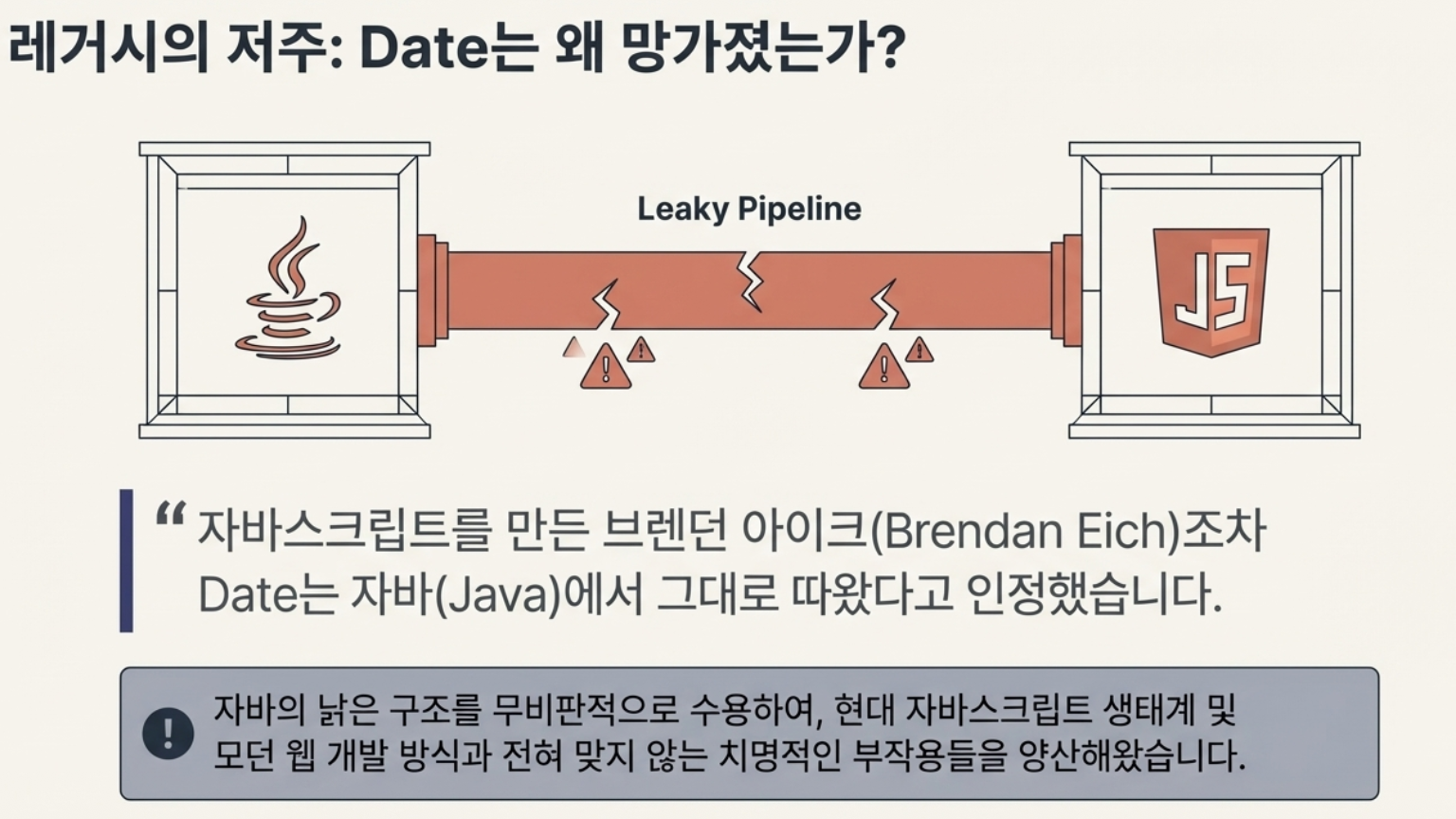 타임존 계산 오류, 비직관적인 월(Month) 인덱스 등 수많은 버그의 온상이 되었고,