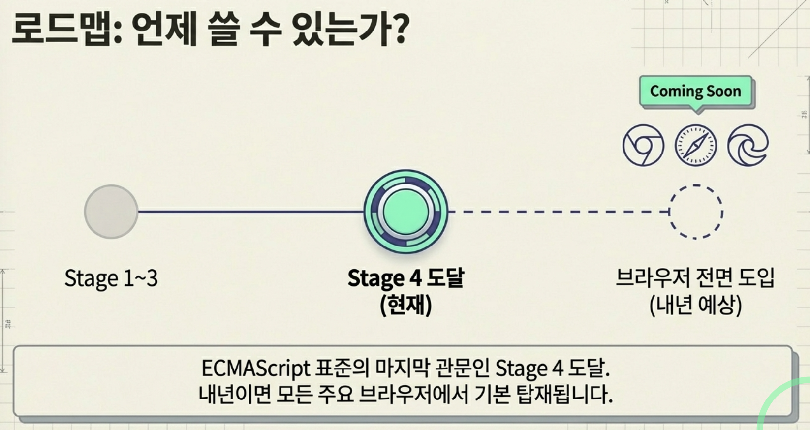 | Temporal.PlainDate | 타임존 계산이 필요 없는 순수한 날짜(생일, 기념일 등)를 다룰 때 적합함. 서버와 클라이언트 간의 시차 때문에 생일이 하루 밀리는 등 고질적인 문제를 원천 봉쇄할 수 있음 |